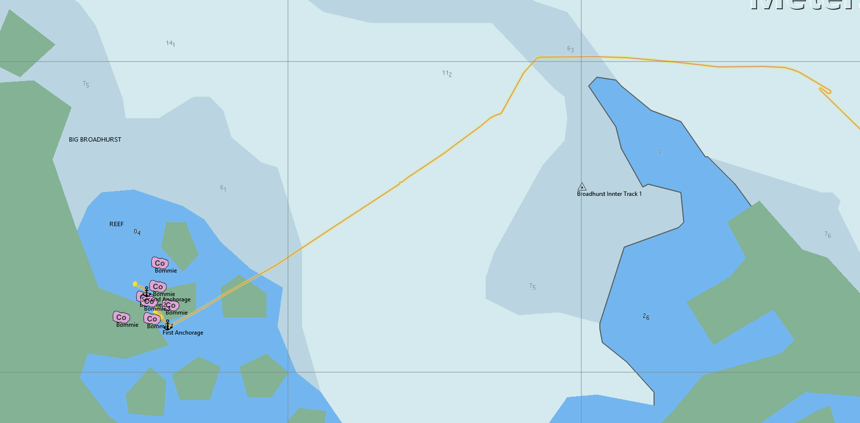 Big Broadhurst is appropriately named: it is about 3.5 miles across and 8.5 miles long, with a large, relatively deep, lagoon in the middle. It's a bit hard to see the reef edge as there is no drying reef, which is a bad sign because it means less protection from the sea. Although we have waypoints from others I am wary of using these and decide to make my own way using the charts as a guide and by eyes as the ultimate protection. Provided conditions are moderate and the time is between about 10AM and 4PM you can see shallow water quite easily before you hit anything. We come through the entrance into the lagoon in about 10m of water and I select an area of coral bommies on the south-western edge of the internal lagoon and set a course for them. The water gets deeper as we move inside the lagoon until we are in 30m. This is a bit worrying as 30m is getting a bit deep for anchoring.