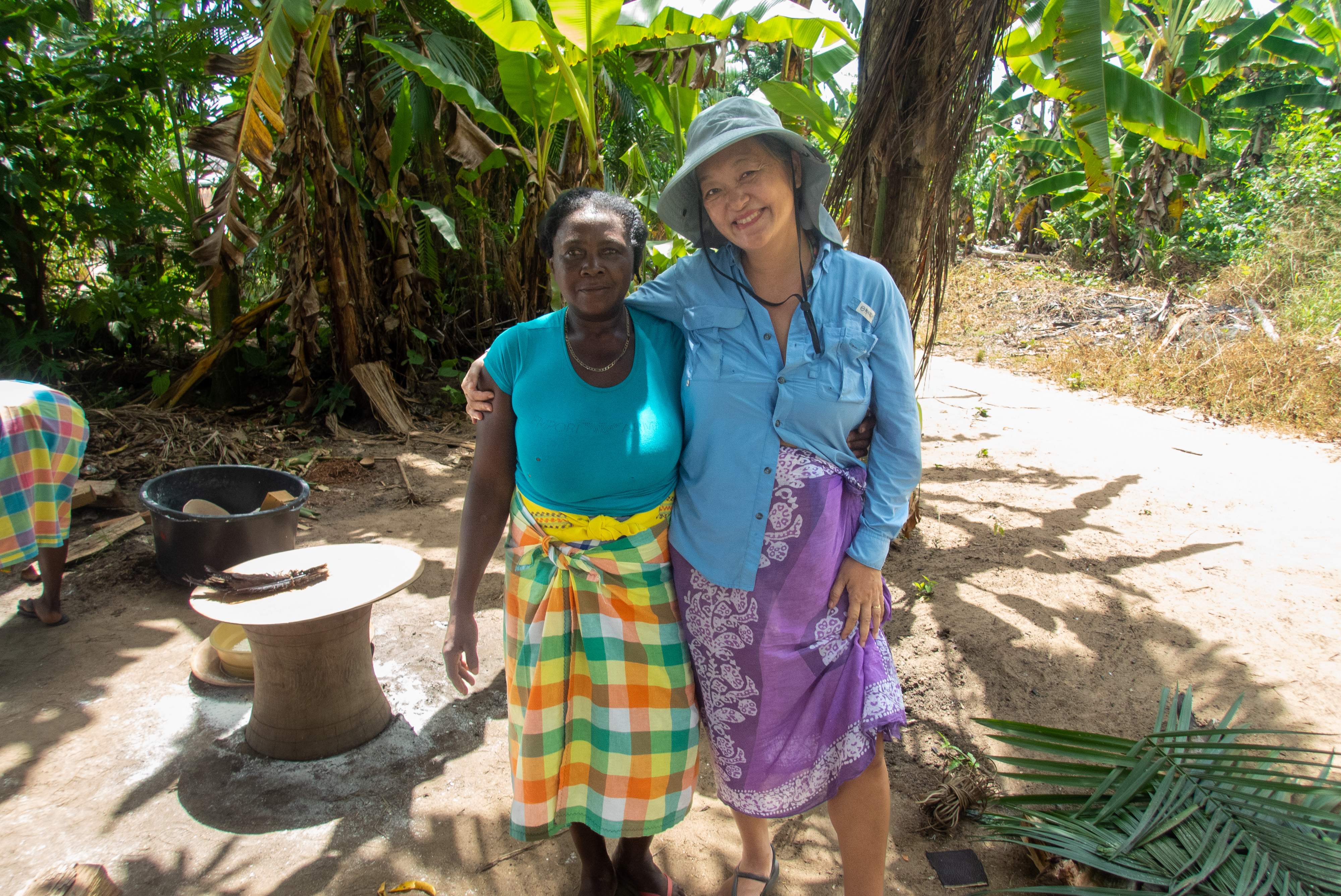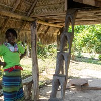 Merel in front of a tranditional hut.